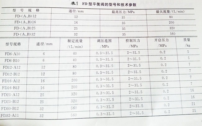 該閥主要用于起重機的液壓系統。使液壓缸和液壓馬達的運動速度不受載荷的影響,保持穩定。它附加的單向閥功能,可防止管路損壞或制動失靈時重物自由降落,以避免事故。其型號和技術參數見表1(FD)型平衡的型號和技術參數