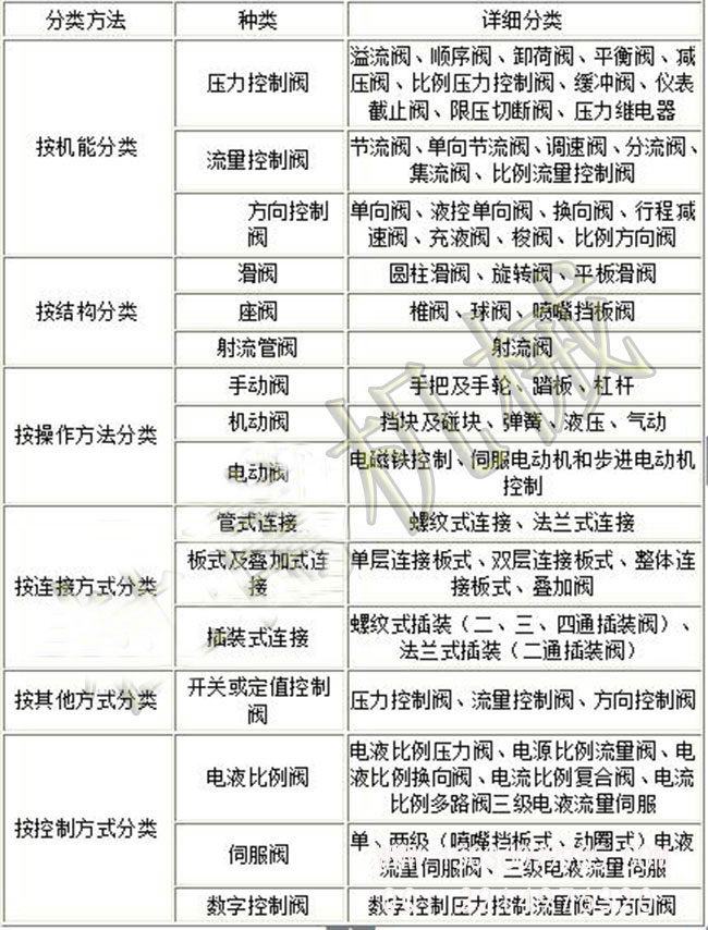液壓閥可按不同的特征進行分類,如表所示: