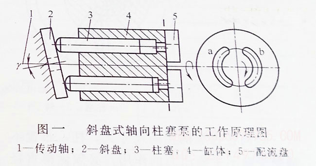 圖一為斜盤式軸向柱塞泵的工作原理圖。它由傳動軸1.斜盤2.柱塞3.缸體4和配流盤5等主要零件組成。傳動軸帶動缸體旋轉,斜盤和配流盤是固定不動的。